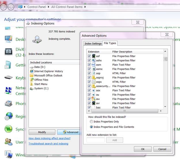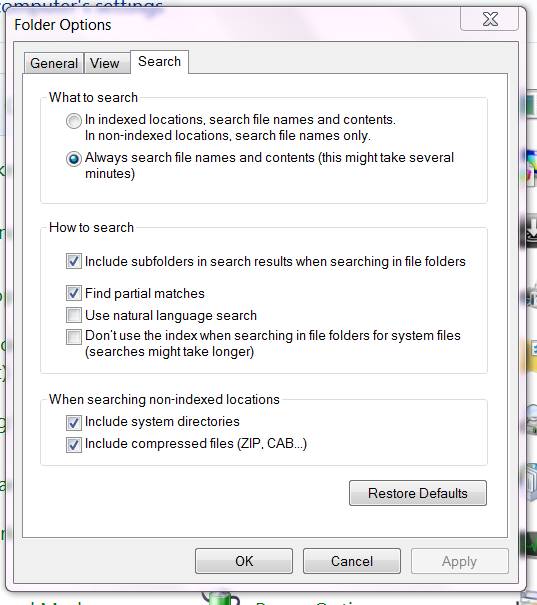 However, manually installing “Always search among names and contents of files”, as shown below, I still cannot get the correct result for searching, say, the text “Cookies” in the file with the .asp extension (one of the standard extensions for web pages by the way, the “native” for the manufacturer of the very Windows 7, with which I am now fighting, trying to get her to do something usual and completely natural).